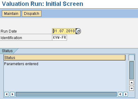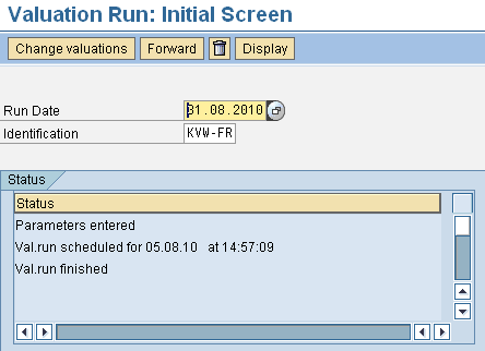 Click the Dispatch button to start the execution of the program. First the transaction creates a proposal that can be adjusted. Keep pressing Enter until you can see on the status window that the status has changed into Val.run finished. Pressing Enter is just necessary to refresh the screen; it doesn’t have any other function. Once the proposed valuation adjustment is ready the initial screen of transaction F107 looks like the screen shown in Figure 10.