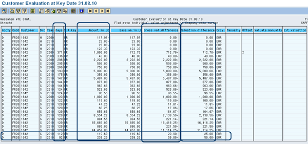 - The third and fourth columns show the gross valuation difference and the net valuation difference. The difference between gross and net valuation difference is the Value Added Tax (VAT). On the lower two rows, you can see a good example of how the calculation works. The two documents are 112 and 92 days overdue. This means that an adjustment of 25% must be made according to the requirements as defined at the beginning of the article. The program calculates 25% of the original amounts and puts that in the third marked column as the gross valuation difference. The amounts still have VAT. The program subtracts the VAT amounts from the gross amount and puts the result in the fourth column as the net amount. The reason the VAT is subtracted is because there is no business risk involved in the VAT.