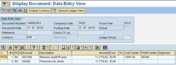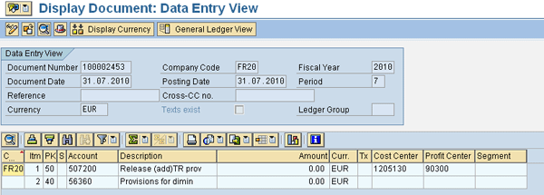 The result of the posting is shown in Figure 13 with transaction FB03. As you can see the amount in document currency (the Amount column) is zero. However, the amount in company code currency will be correct. Click the Display Currency button to see the posting in company code currency (Figure 14). Depending on your settings for displaying financial postings, you may have to select a display variant.