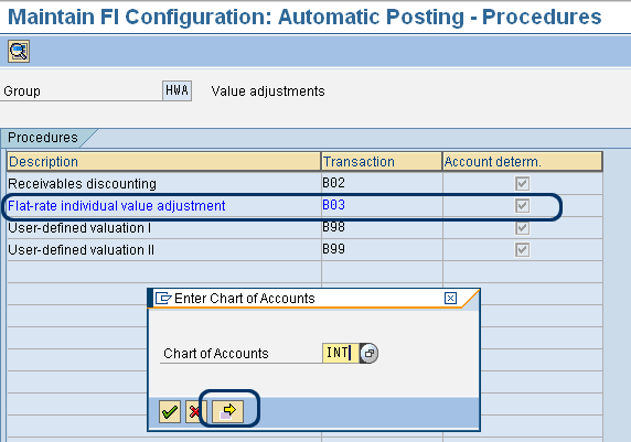 Figure 2 shows the selection screen of transaction OBB0. Double-click the line for the flat-rate individual value adjustment (transaction B03). A pop-up screen appears; on this you can enter the chart of accounts. When you use valuation areas, as in my example, you have to click the yellow arrow icon. Otherwise, you would just click the green check mark icon.