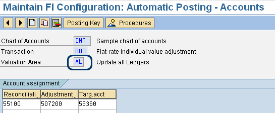 - Valuation: This is the valuation area. You can carry out closing according to various legal regulations (e.g., US GAAP or German Commercial Code) in which different valuation principles apply. To make that distinction, you can use valuation areas. In my example, I use AL, to mean all valuation areas.