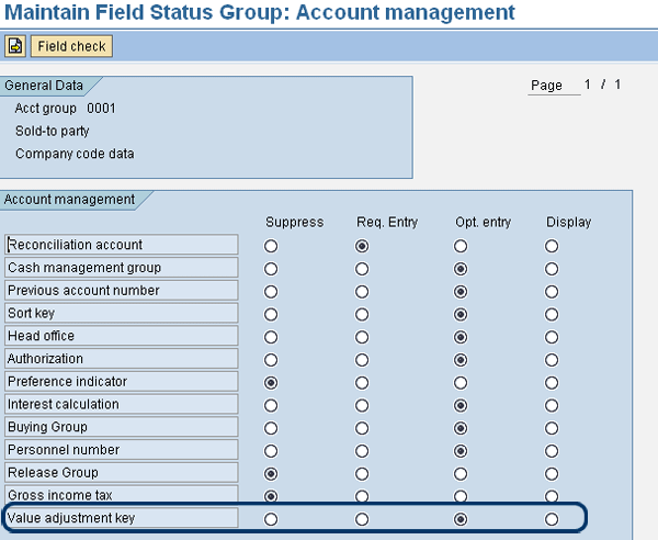 Step 3 (optional). This is only necessary if the value adjustment field in the customer master data is not available. Use transaction OBD2 or follow menu path Financial Accounting (New) > Accounts receivable and Accounts Payable > Customer Accounts > Master Data > Preparations for Creating Customer Master Data > Define Account Groups with Screen Layout (Customers) (Figure 4). Because this transaction is a very basic customizing transaction and a little bit out of scope, I won’t explain it in full detail. Per customer account group, you go to the screen where you maintain the fields for Account management and make sure that the Value adjustment key is either optional or required.