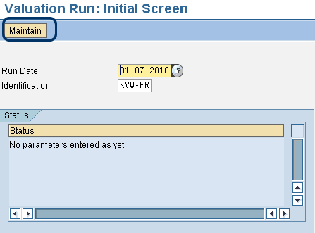To calculate and post the value adjustment, use transaction code F107 or follow user menu path Accounting > Financial Accounting > Accounts Receivable > Periodic Processing > Closing > Valuate > Further Valuations. Figure 6 shows the start menu of the transaction. Enter a run date and identification and then click the Maintain button to maintain the selection parameters of this transaction. As F107 is a transaction that can be used by all users, it is recommend to use an identification that makes clear whose valuation it concerns — for example, which company code, and what kind of customers, such as local or foreign customers.