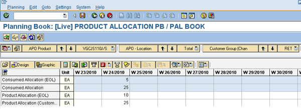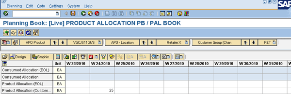 In this example, product allocations are maintained for 25 pieces for week (W) 24/2010 for the product VGCJS110J/S for the customer RETAILER X (Figure 6).