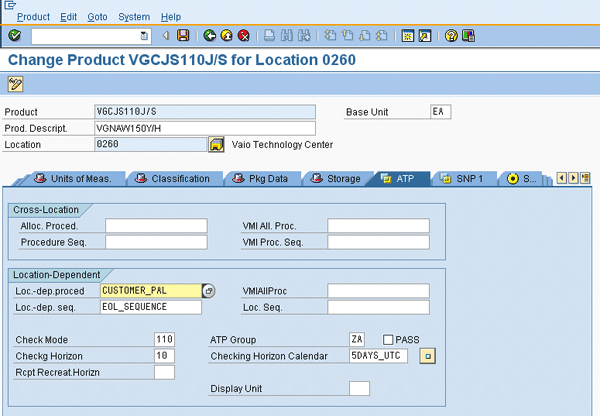 Once the product allocation procedure and sequence are defined, you manually assign them in the product location master in SAP APO in the ATP tab (Figure 5). The first check is performed using the product allocation procedure in the product master using the CUSTOMER_PAL procedure (the value assigned in the Loc.-dep.proced field in Figure 5). If there is still quantity to be confirmed in the sales order, then the system checks the product allocation procedure in the product allocation sequence EOL_SEQUENCE (assigned to the Loc.-dep. seq. field) and finds the CUSTOMER_GROUP_PAL (as shown in Figure 2) to perform the check. Note that the first procedure in the EOL_SEQUENCE (CUSTOMER_PAL) is the same as the product allocation procedure assigned in the product location master. The system ignores the redundant entry (i.e., it does not perform the check with the same product allocation procedure twice when the allocation check is performed for a sales order).