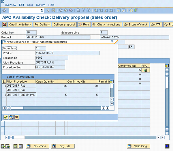 AÂ sales order is manually created for the product VGCJS110J/S for 25 pieces. In this case, the sales order is confirmed for 25 pieces based on the Product Allocation (Customer level) of 25 pieces for the product and customer RETAILER X. For the remaining quantity of five pieces (not confirmed), it does not find enough product allocations for customer RETAILER X. A second product allocation procedure in the product allocation sequence CUSTOMER_GROUP_PAL performs the check and confirms the remaining five pieces against the product allocation quantity of the 10 pieces that are available.
