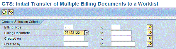 You can transfer billing documents by clicking the execute icon in the Transfer Billing Documents row under the Initial Transfer of Documents to SAP GTS tab shown in Figure 7. The screen shown in Figure 10 appears. Populate the Billing Type and Billing Document fields. Click the execute icon to transfer the billing document to SAP BusinessObjects Global Trade Services.