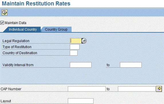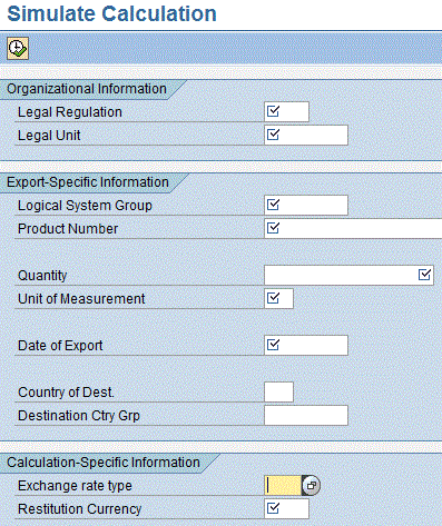 In the screen shown in Figure 19, enter the mandatory fields, such as Legal Regulation, Legal Unit, Logical System Group, Product Number, Quantity, Unit of Measurement, Date of Export, and Restitution Currency, to calculate the restitution amount for the product.
