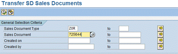 In the Sales Document field enter the sales order number that you wish to transfer and populate the Sales Document Type field. Click the execute icon (Figure 8).