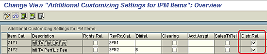 Next, to make the item categories relevant for lean distribution, follow IMG menu path SAP > Customer Relationship Management > Industry-Specific Solutions > Media > Intellectual Property Management > Transactions > Define Settings for IPM Item Categories. Mark the check box for Distr. Rel. (relevance of distribution) for the required item categories, as shown in Figure 2.