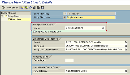 In the screen that appears, the billing plan lines should only include the line type milestone billing or periodic billing (Figure 3). With lean distribution, there is no billing plan for revenue distribution. Instead, the set IPM_REVDIST is used. With the old distribution functionality (i.e., non-lean), there is a billing plan for revenue distribution.
