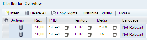 This functionality is ideal when you have a large contract and the rights are distributed to multiple media, territories, and languages, because each of these combinations and entries will be stored in table CRMD_IPM_REVDIST. In contrast, a contract that does not have lean distribution will have an entry for distribution rights in tables CRMD_ORDERADM_I, CRMD_PRICING, CRMD_PRICING_I, and CRMD_ORGMAN.