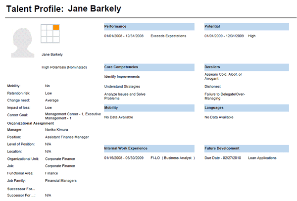 The talent management specialist (or whoever is responsible for talent management) organizes the talent review meetings using SAP ERP HCM succession management. With this functionality the specialist creates the meeting agenda and includes the participating managers as attendees. The agenda contains the details and assessments of the employees to be discussed in a talent profile (Figure 1).