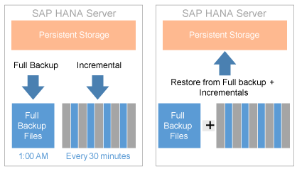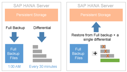 Depending on the volume of data stored in SAP HANA, the traditional full backup can take from several minutes to several hours to complete. The size of the full backup is typically proportionate to the size of the SAP HANA persistent disk data files. The backup can be conducted while the SAP HANA system is running. Because the SAP HANA system is operational, careful attention should be given to the duration of the backup and the resources it consumes. For scalability purposes, SAP HANA offers two delta backup processes (discussed below) to reduce the duration and impact to SAP HANA resources.