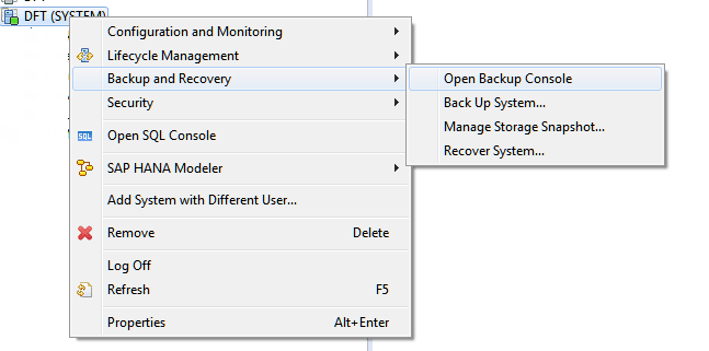 To access the backup console, right-click your system in SAP HANA studio. Choose Backup and Recovery from the pop-up menu in