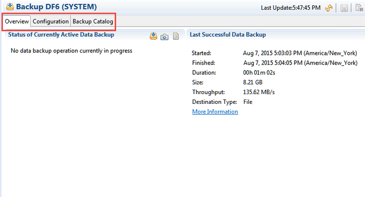 The backup console Overview tab contains information about in-progress and prior backups. Tabs at the top allow administrators to see an overview, access backup configuration, and view the backup catalog information.