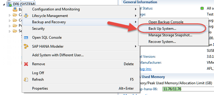 To execute a backup, administrators can right-click their systems in SAP HANA studio. As shown in