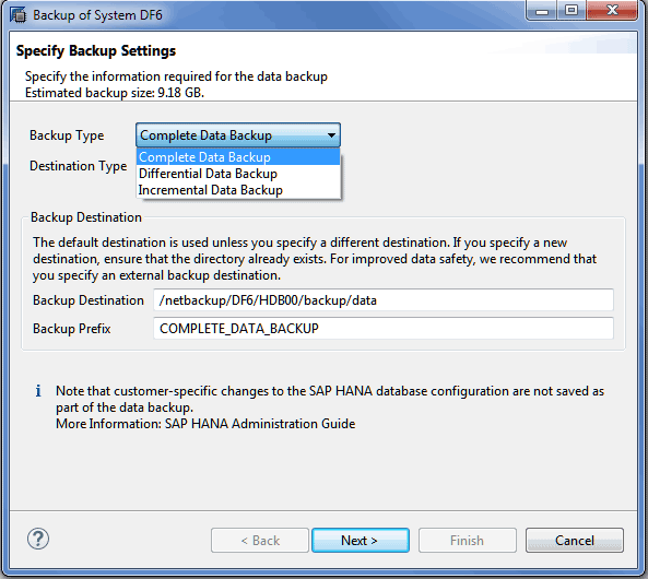Figure 8). Within this window administrators can choose one of the three backup types mentioned before. Again, the two delta options of incremental and differential are only available as of SAP HANA SPS10. You can also specify the backup destination path and backup file prefix name. Additional text is added to the backup prefix automatically by the system, and it will be reflected in the backup sets file names. The backup destination defaults to the path specified in the backup console Configuration tab. To start the backup, click the Next button and then the Finish button.