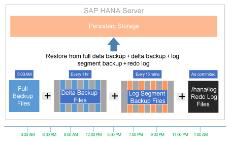 Depending on your recovery scenario, different files are required to restore the SAP HANA system. Before you can consider recovering your SAP HANA system, at least one available full-data backup must exist. Then, depending on the recovery scenario, delta backup files followed by redo log files, and finally log-segment backup files might be required.