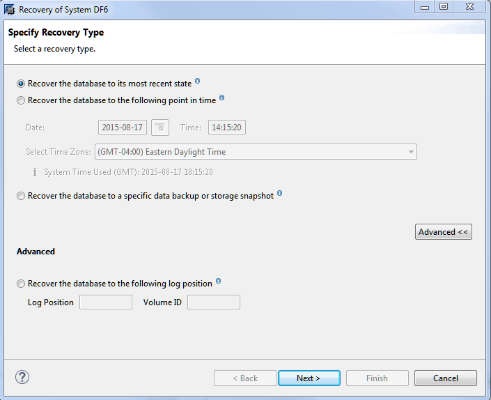 The first option allows you to recover the system to its most recent state. You can also recover to a specific point in time or to the most recent full data backup or storage snapshot. Under the advanced options, you can also choose to recover the system to a specific log position and volume ID. If you choose to recover to the most recent state or to a point in time, you must specify the location of the data and log-segment backup files. Click the Next button to go to the Locate Log Backups window. When recovering to the most recent state, a window, depicted in