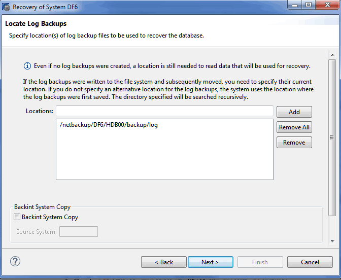 USING LOG PATH ('/netbackup/DF6/HDB00/log')” –wait |