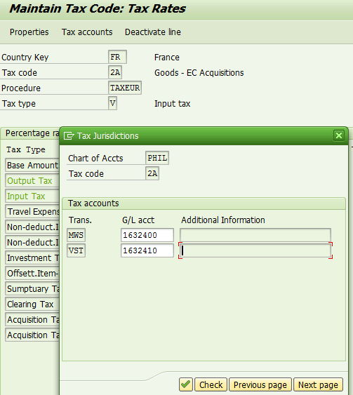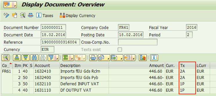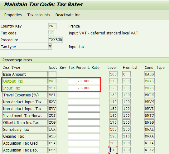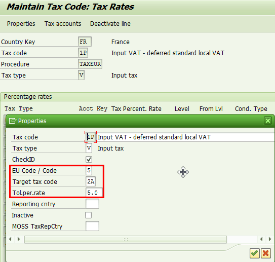 For deferred taxes you need to define two codes. One code is the deferred VAT code, as shown in Figure 1, and the other code is the destination tax code (Figure 2). Figure 1 shows an example. Code 1P is the deferred tax code, and code 2A in Figure 2 is the destination tax code.