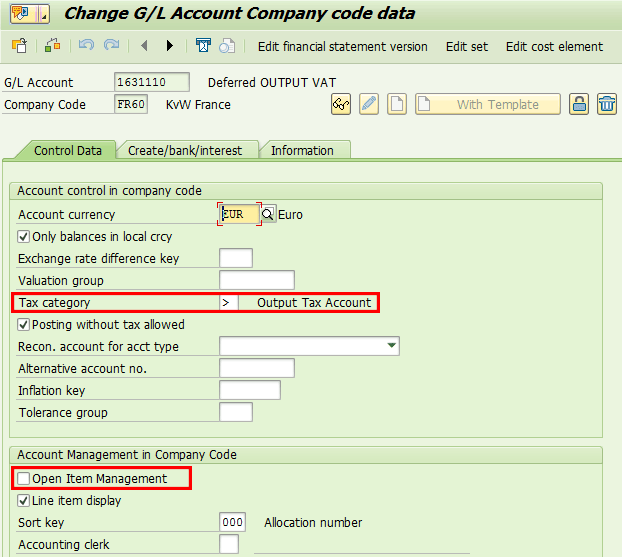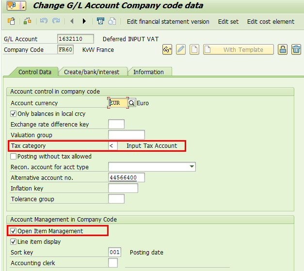 In the Account Management in Company Code section of Figure 7, the account used for the posting of the output VAT must not be marked as open item managed (i.e., the Open Item Managed check box is not selected). The account used for the posting of the input VAT must be marked as open item managed (i.e., the Open Item Management check box is selected) as shown in Figure 8.