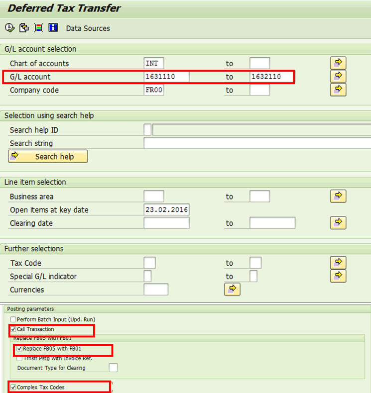 - Select the Replace FB05 with FB01 check box. The consequence of this indicator is that the clearing of the original tax posting is done in two steps. First, a posting is made with transaction code FB01 and then in a second step, a clearing document is created.