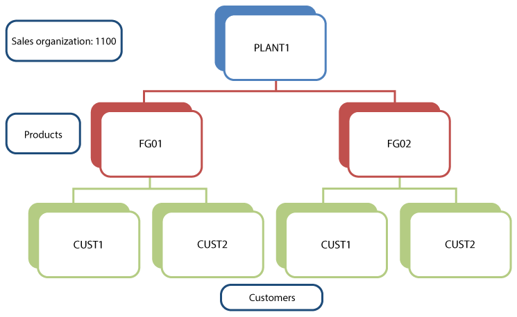 Consider an example of a simple supply chain network of a manufacturer consisting of a single plant and sales organization. Figure 2 diagrams the supply chain network for this scenario. PLANT1 manufactures two products, FG01 and FG02, both of which are very scarce and therefore in large demand. CUST1 and CUST2 are two large customers being served by the manufacturer, and they purchase both the products being produced. Since there is a bottleneck on the amount of products of each type that can be produced, you need to carry out some sort of product allocation to ensure that both the customers get some fixed allocated quantity of each product. Without product allocation, only one of the customers would exhaust the entire inventory, thereby making the other customer get zero quantity. For example, since there is constraint on the quantity of products that can be manufactured, the customers who order first (e.g., CUST1) have the entire inventory of product available to them and thus can order in large quantity leading to a stock out. This outcome is not desirable.