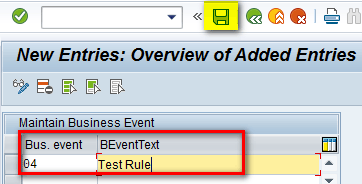 In the next screen (Figure 5), enter the name of the Business Event (e.g., 04) and a text description (e.g., Test Rule). Click the save icon.