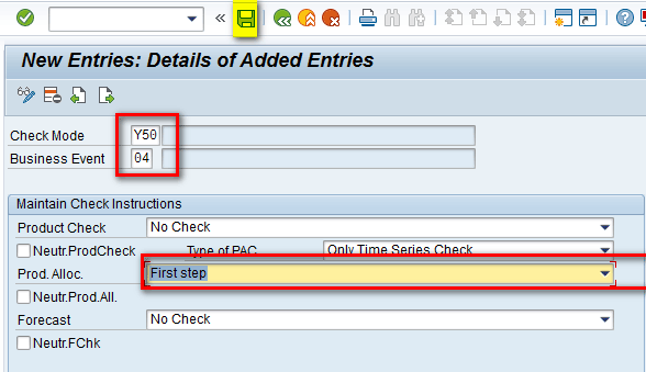 This action opens the screen shown in Figure 9. Enter data in the Check Mode and Business Event fields (e.g., Y50 and 04, respectively). The Check Mode and Business Event were created in steps 1 and 2. In the Product Alloc. field, select First step from the drop-down list of options and click the save icon. In the Forecast field, do not change the default No Check option.