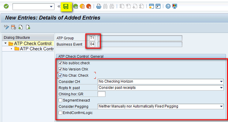 In the next screen (not shown), click the New Entries button, as shown in steps 1, 2, and 3. This action opens the screen shown in Figure 11. Enter values in the ATP Group and Business Event fields (e.g., T1 and 04, respectively). In the ATP Check Control: General section, select the three check boxes at the top of this section (No subloc.check, No Version Chk, and No Char. Check). In the Consider CH, Rcpts fr. past, and Consider Pegging fields, select No Checking Horizon, Consider past receipts, and Neither manually nor Automatically Fixed Pegging, respectively, from the drop-down menu options shown in Figure 11 and then click the save icon.