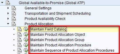 To define the objects and configurations, execute transaction code SPRO and follow menu path Advanced Planning and Optimization > Global Available-to-Promise (Global ATP) > Product Allocation. For each of the steps that you need to complete for product allocation, you expand the Product Allocation node and click one of the subnodes as shown in Figure 13.