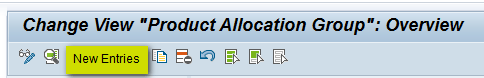 The Product Allocation Group is used to define a set of characteristics that can be used for product allocation quantities. To define a new Product Allocation Group, click Maintain Product Allocation Group (Figure 13). In the next screen, click the New Entries button as shown in Figure 17.