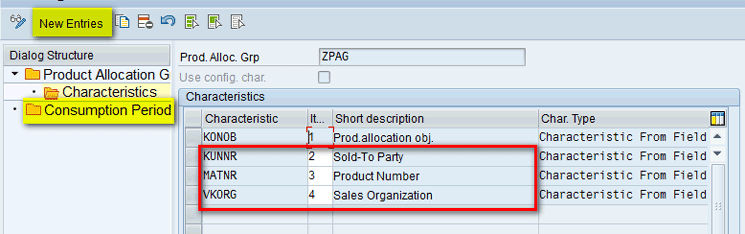 In the next screen (Figure 19), click the New Entries button and add rows for characteristics KUNNR, MATNR, and VKORG. Click the Consumption Period folder as shown in Figure 19. (Row 1 [KONOB/Product Allocation Object] is automatically populated when you click the New Entries button and is always the first row.)