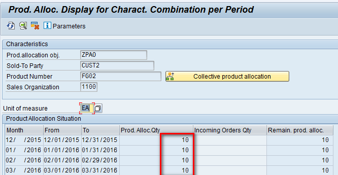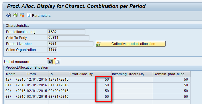 In the next screen (Figure 44), you can see that entire quantity of 200 is confirmed and the maximum allocation in each month is 50, which is what was defined in the Planning Book in Figure 28.