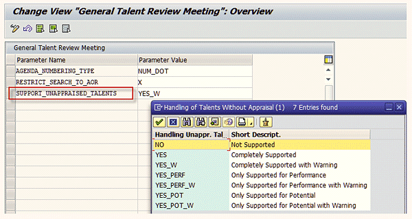To include talents with incomplete rankings, you have to complete configuration settings in transaction SPRO. The menu path for the configuration setting is SPRO > Talent Management and Talent Development > Talent Review Meeting > Make additional settings for Talent Review Meetings. Here, you provide a value to the parameter SUPPORT_UNAPPRAISED_TALENTS. The possible values for this parameter are shown in Figure 3.