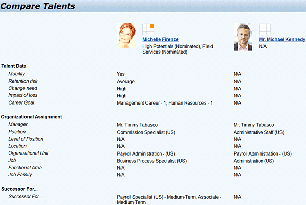 In SAP ERP HCM Talent Management, it is possible for managers and talent management specialists to display talent profiles side-by-side and conduct talent comparisons. For example, you can use this functionality to compare a talent with your top talent (higher performer/high potential) and identify potential areas for improvement.