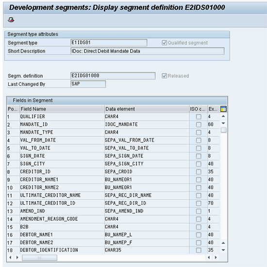 Data segment E1IDS01contains 26 fields from SAP’s mandate management component (see table SEPA_MANDATE). The segment can appear twice with the qualifier ACT (current mandate data) and the qualifier ORIG (original mandate data). The reason for this distinction is that the SEPA rules foresee so-called mandate amendments to record alterations of an existing mandate such as a new address or a new debit amount. The PEXR2003 shows the ACT-Segment first. If there is a second ORIG-segment, the SAP system fills the field E1IDS01-AMEND_IND with X. This segment is only created by the system for the IDoc type DIRDEB. A prerequisite would be that the payment run picks up a mandate (the field MGUID in the table REGUH is filled).