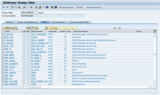 - NAME1 to NAME4 (for the name of the creditor coming from the fields SND_NAME and the name of the debtor coming from the field REC_NAME in table SEPA_MANDATE. NAME3 and NAME4 are currently empty, though)