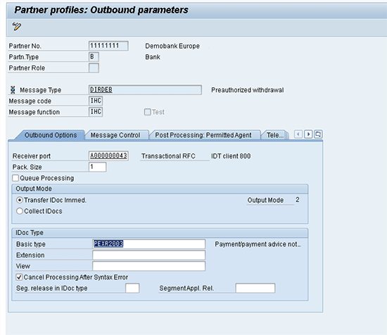 The relevant SAP In-House Cash configuration that needs to be adapted is the partner profiles for communication between the logical SAP systems. Follow menu path Tools > ALE > ALE Administration > Runtime Settings > Partner Profiles or use transaction WE20. You need to make sure that the new IDoc type PEXR2003 is registered for the two IDoc message types DIRDEB and PAYEXT within the partner profile of the receiving bank. You can double-click the existing DIRDEB and PAYEXT nodes to display the current IDoc type (Figure 4).