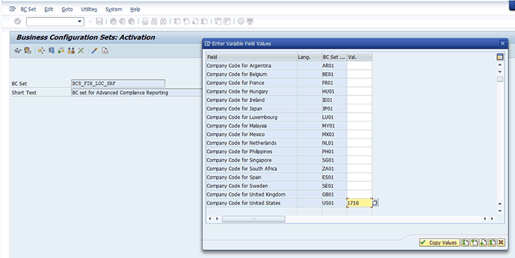 In Figure 4, map your legal entities to the model company code for the country and click the Copy Values button to view the activate options for this BC Set in Figure 5.