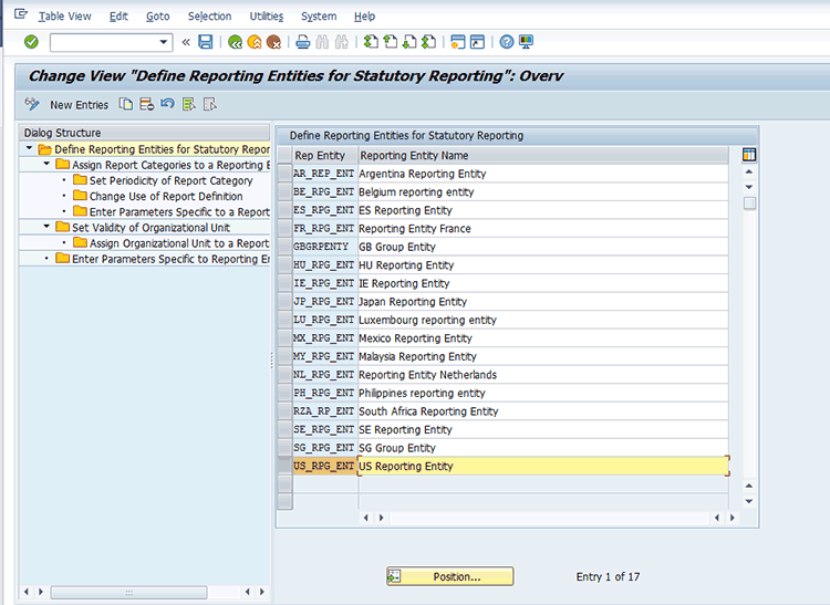 Select the validity date in Figure 12 and click the Assign Organizational Unit to a Reporting Entity folder on the left side of the screen. In the next screen (Figure 13) you can see the company codes assigned to the reporting entity, out of which one has to be marked as a leading company code.