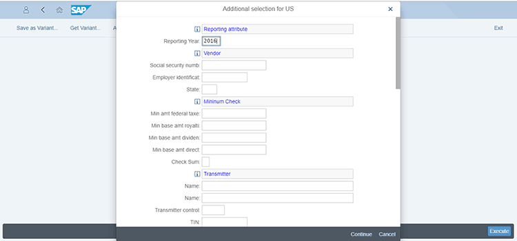 After you click the New Run button the system opens the screen in Figure 19 in which you define the parameters for the report selection screen or use a predefined variant. Click the Execute button to run this report.