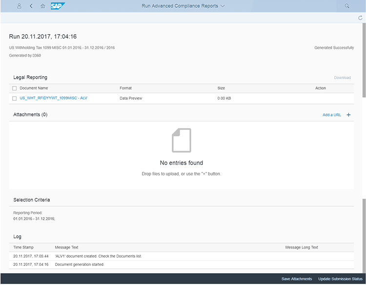 The reports that are generated are stored and linked in the SAP S/4HANA for advanced compliance reporting tool cockpit itself and can be easily referred to in any audit. Data about who generated or submitted a report and at what time the report was generated or submitted is recorded with full logs.