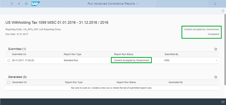 If you go back to the report in SAP S/4HANA for advanced compliance reporting and click the refresh icon (not shown), you can see the generation status updated as shown in Figure 22.