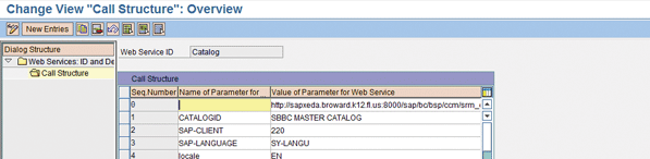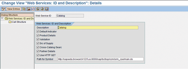 Step 1. Set web services: ID and description. Â Follow menu path IMG>Materials Management>Purchasing>Environment Data>Web Services: ID and Description (Figure 9). Specifying Web service, parameters, and call structure enables the activation of the catalog button in the purchase requisition and purchase order transactions. The key fields for the first screen are shown in Figure 9.