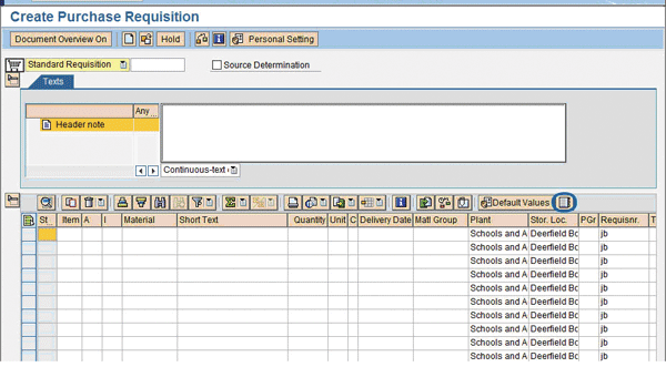 After the initial creation or subsequent updates, the appropriate group in the organization publishes the master catalog. You can then access it by clicking on the catalog icon in transactions ME51N (create purchase requisition), ME52N (change purchase requisition), ME21N (create purchase order), and ME22N (change purchase order). Figure 2 shows the catalog icon in transaction ME51N.