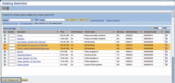 After selecting the items and adjusting the quantities, click on the Add to Shopping Cart button. This adopts the items into the purchasing document (Figure 5). The shopping cart functionality significantly enhances the productivity level because you can select and adopt numerous items from the catalog instead of searching for items line by line in transaction ME51N. It also eliminates errors during the processing of purchase requisitions and adopts pricing along with the item. Â
