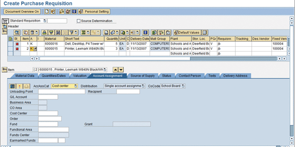 Take the example of a school district order requisitioning process. In this scenario, the requisitioner is required to order a significant number of items, such as textbooks, on a periodic basis for a number of schools. The shopping cart functionality improves the productivity and accuracy of requisition creation in ECC, which is significant because there could be more than 100 textbooks for each school that need to be ordered from the warehouse. With the catalog functionality, the user picks the items from a catalog without searching for items individually with the material search or manually entering them in ECC. The catalog enables the selection of multiple items at one time for further processing. This functionality is valuable in a process in which there are significant numbers of items to order internally or externally.